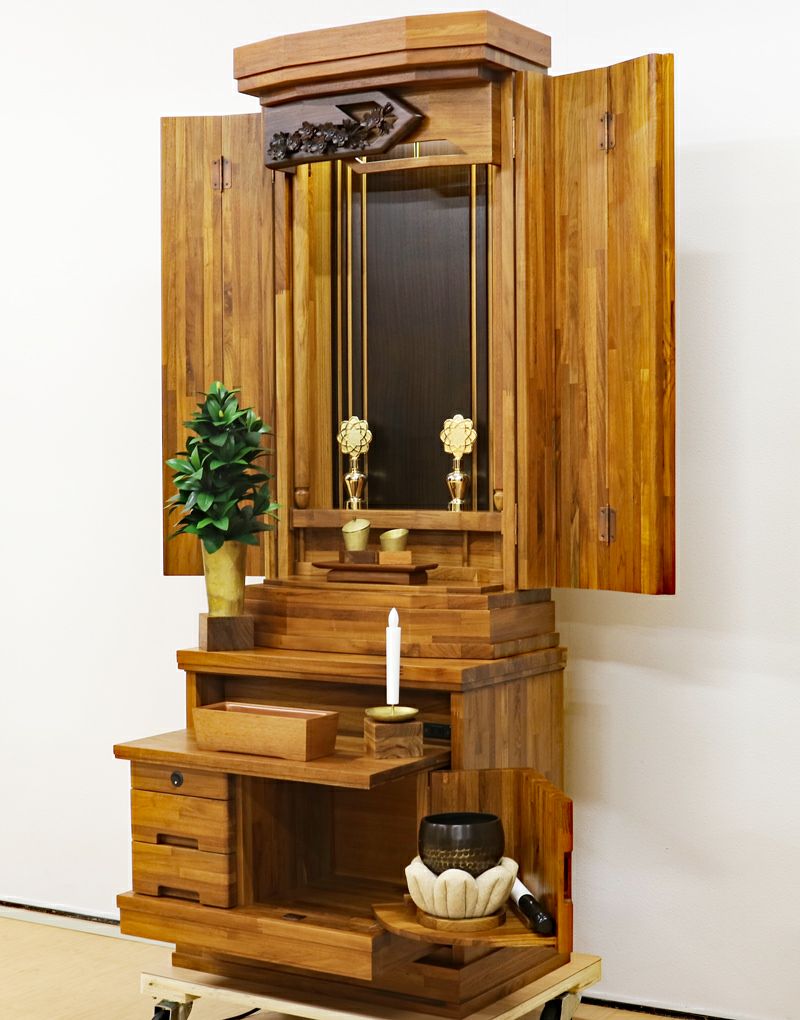 金剛堂さんにて現在新品仏具付価格413,030円で販売している「402ニヤトー総無垢 花包み 本金箔仕様」の前のバージョンに当たる「401 チーク無垢 花包み」の中古仏壇です。
