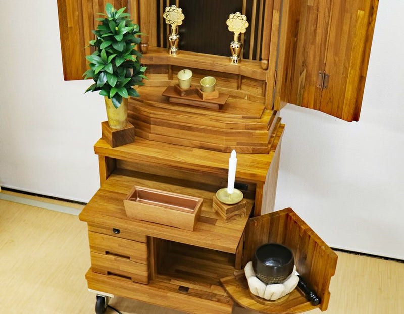 大戸が三方開きになるお仏壇ですので、三方開きにすると視野が広がり斜めからでも御本尊様を拝すことができます。