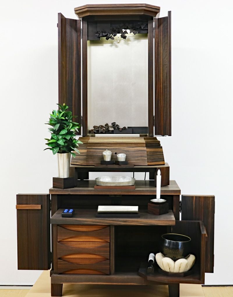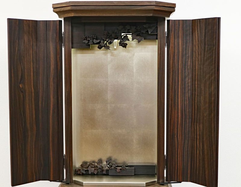 葡萄科のエビカズラとも言われる「えびづる(EBIZURU)」をモチーフにした繊細な彫刻を、厨子内の欄間と下部に対象的に配置した繊細なデザイン。御本尊様を荘厳に御安置したいとの思いから生まれました。