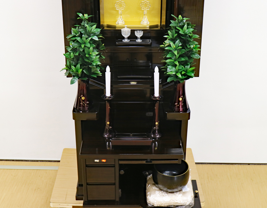 仏具付き選択の場合は、銅器生産で有名な高岡製の彫金入り銅器仏具セットが付属いたします。