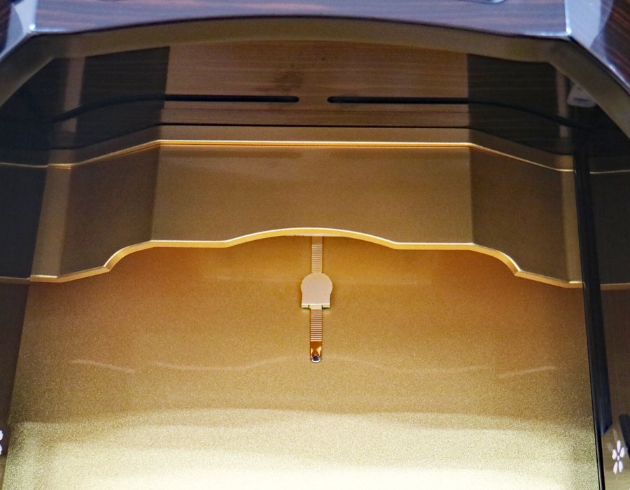 お厨子を開くと美しい厨子板がご本尊様をさらに荘厳にしてくれます。 内部には蛍光灯照明も付属していますのでご本尊様を明るく照らしてくれます。