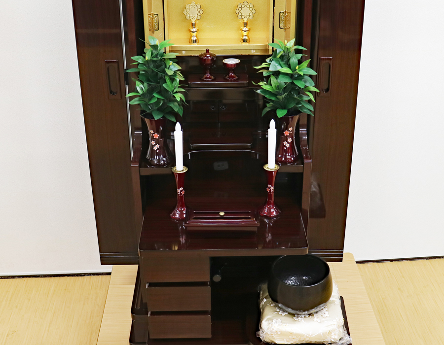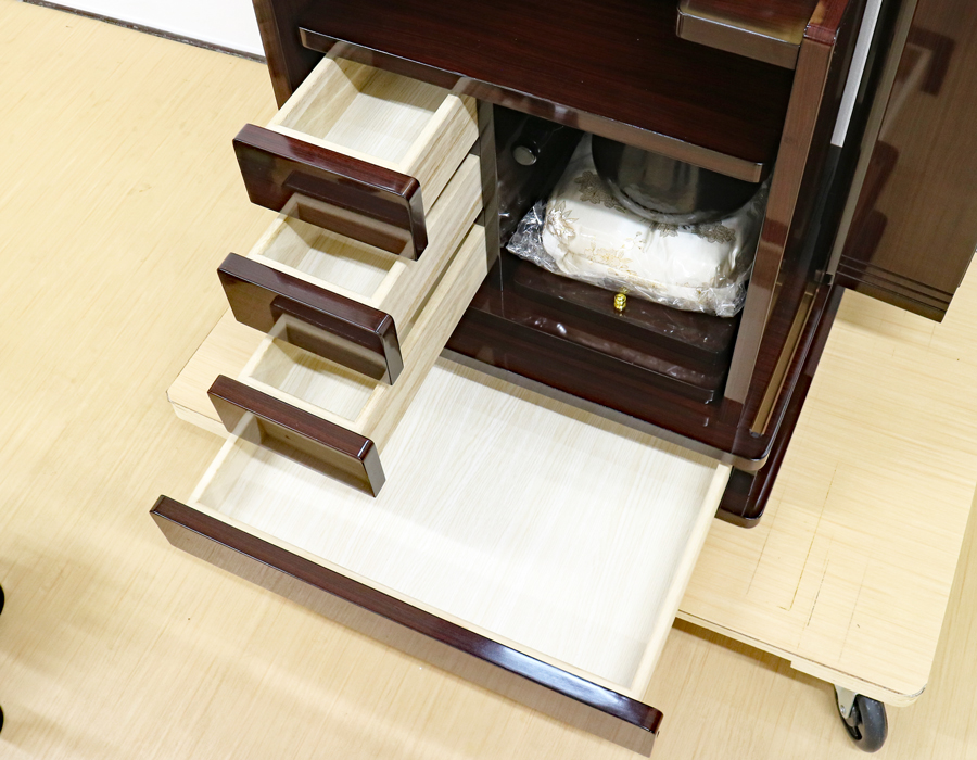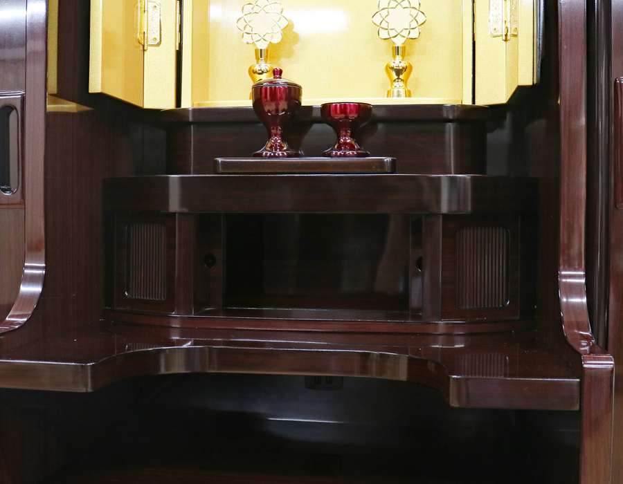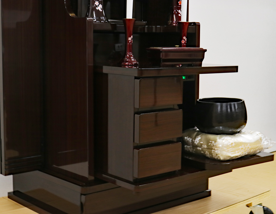 お仏壇下部に引き出しが4か所ございます。 お念珠・お教本・お線香・大白蓮華・短冊なども余裕をもって収納できます。