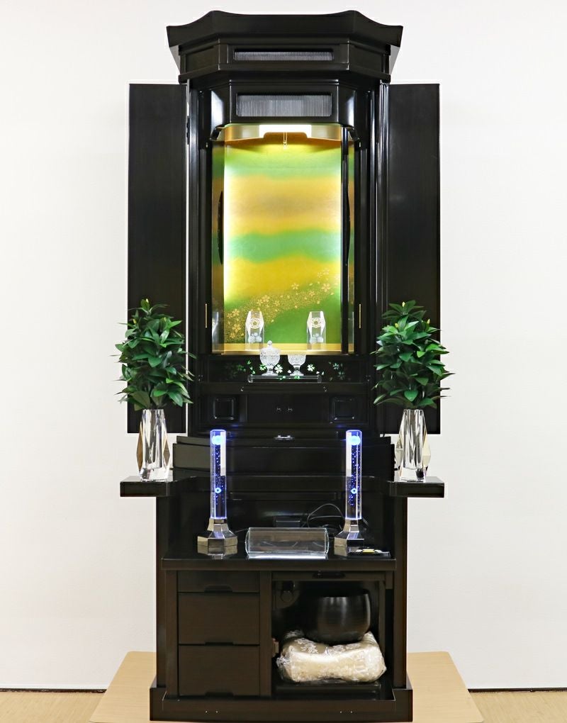 お厨子は鮮やかなグリーンとゴールドイエローの美しいデザインに仕上がっております。
