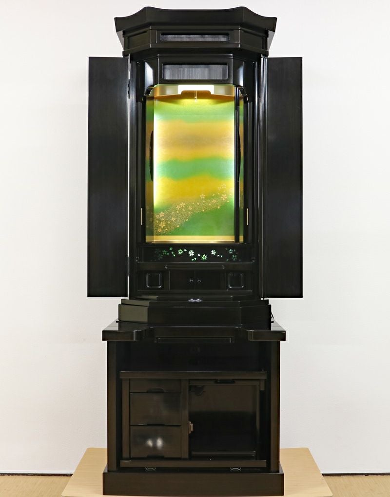 厨子扉・厨子下には桜の彫が鮮やかな緑が演出されるおしゃれなデザインに仕上がっております。
