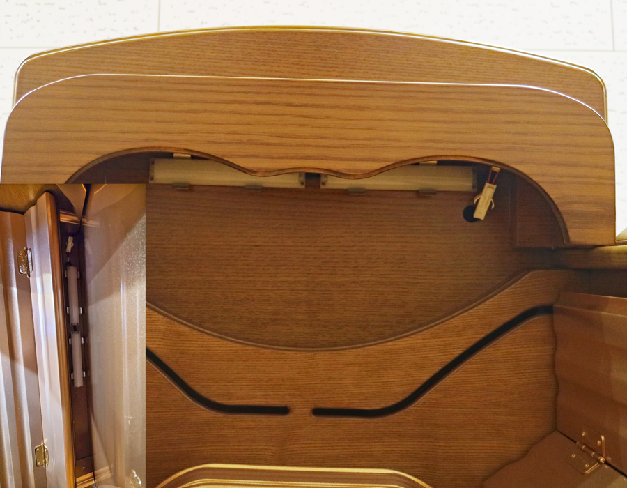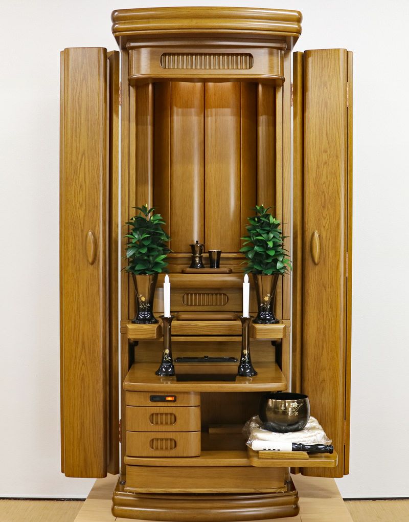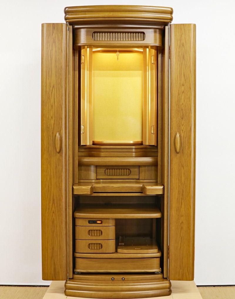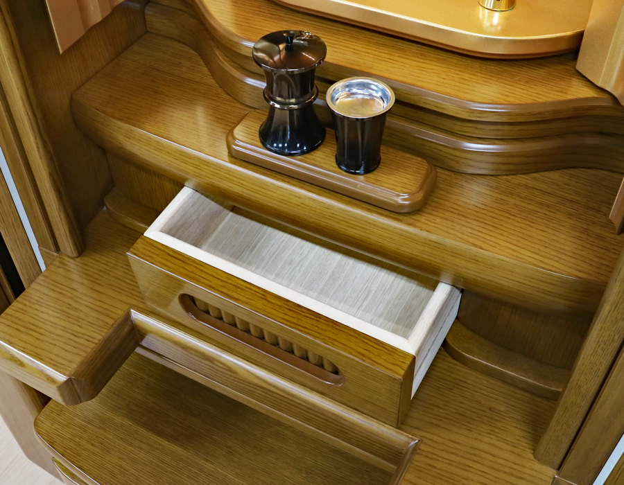 お厨子を開くと美しくクリア金色塗装厨子板がご本尊様をさらに荘厳にし、3か所のLED照明で仏壇内を適度に明るく照らしてくれます。