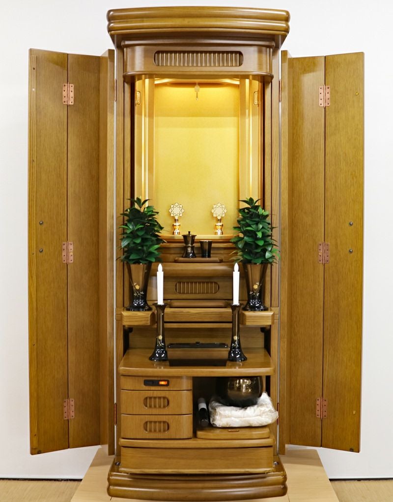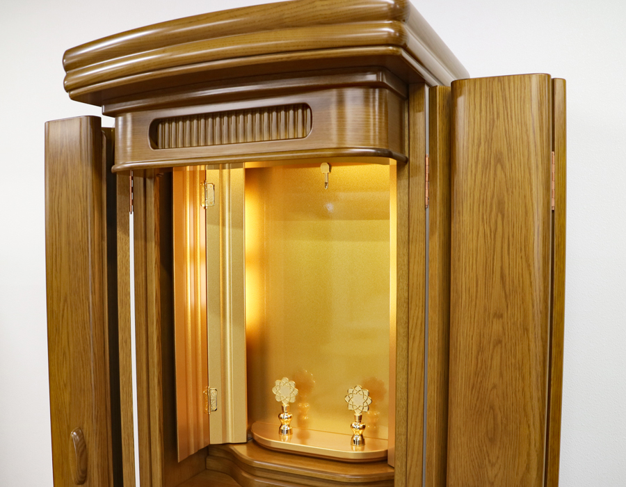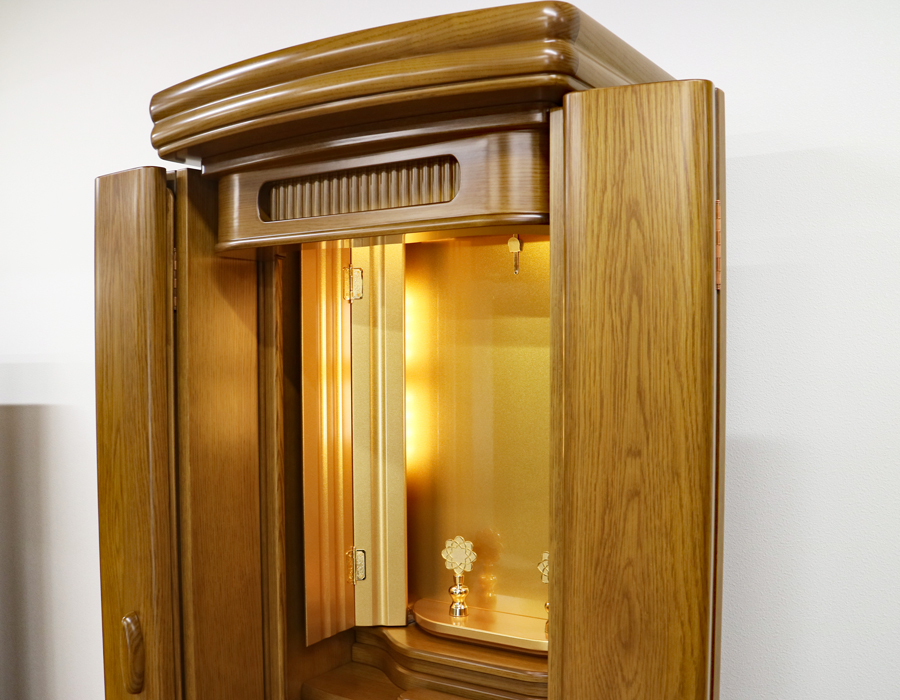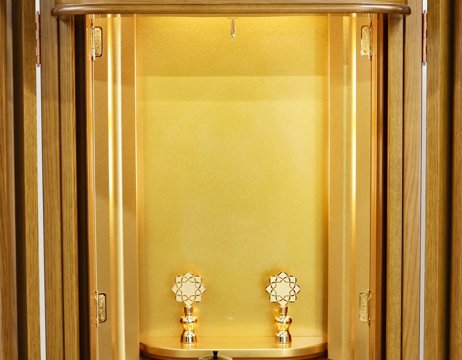 照明は、厨子内上部だけでなく、両脇にもLED照明がついている彩光厨子を採用しているため、ご本尊様を明るく拝すことができます。