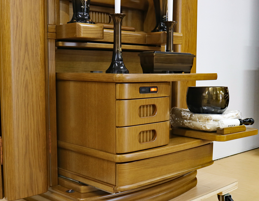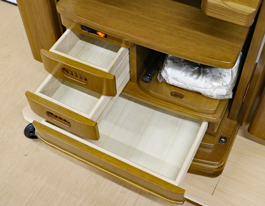 収納経机に3か所引き出しがございますのでお経本・念珠など充分に収納できます。