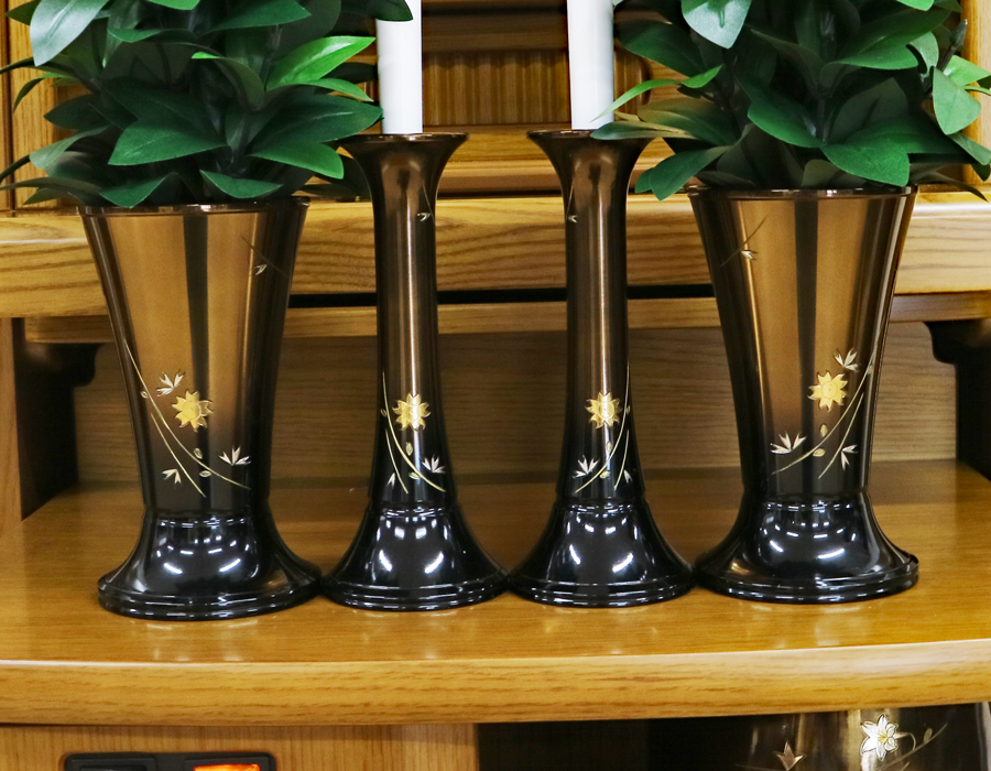 仏具付き選択の場合、上記お写真の中古の高岡製百合彫金入りボカシ銅器仏具セットが付属いたします。