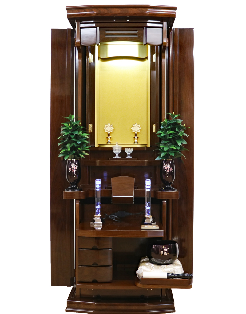 品格あるウオールナットの色味と木目は心の安らぎと希望溢れる請願の祈りの題目をあげるためのすばらしい仏壇になります。大切につかわれ、綺麗な状態ですのでおすすめの商品になります。 リモコン仕様の仏壇で蛍光灯からLED照明に当店にて新品に交換いたしました。 大戸は押し込み式の大戸を採用しておりますので、大戸を全部開くことによって斜めからでもご本尊様を拝すことができます。会場・拠点にも十分対応できます。