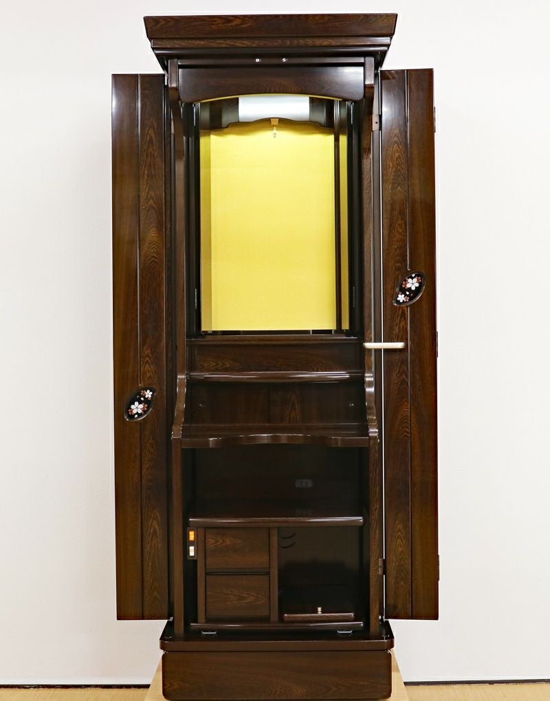大戸の4か所桜の蒔絵が特徴の中古仏壇になります。 大戸は押し込み式の大戸を採用しておりますので、大戸を全部開くことによって斜めからでもご本尊様を拝すことができます。会場・拠点にも十分対応できます。