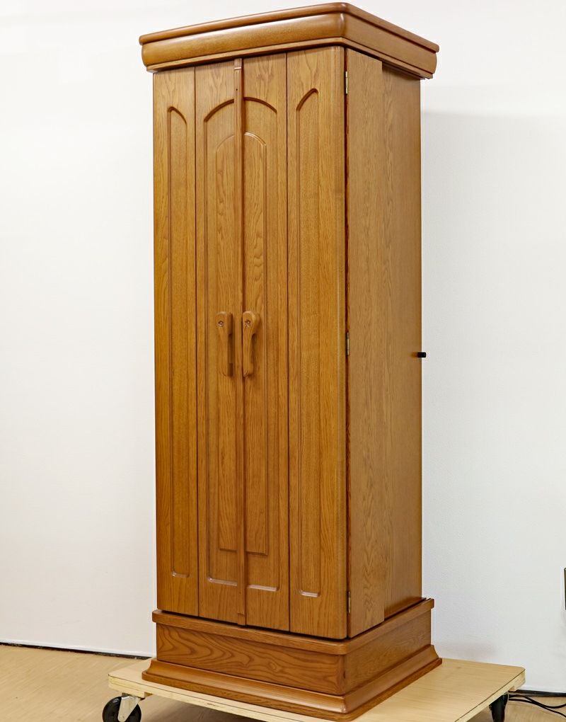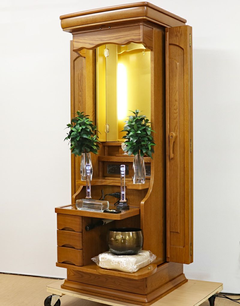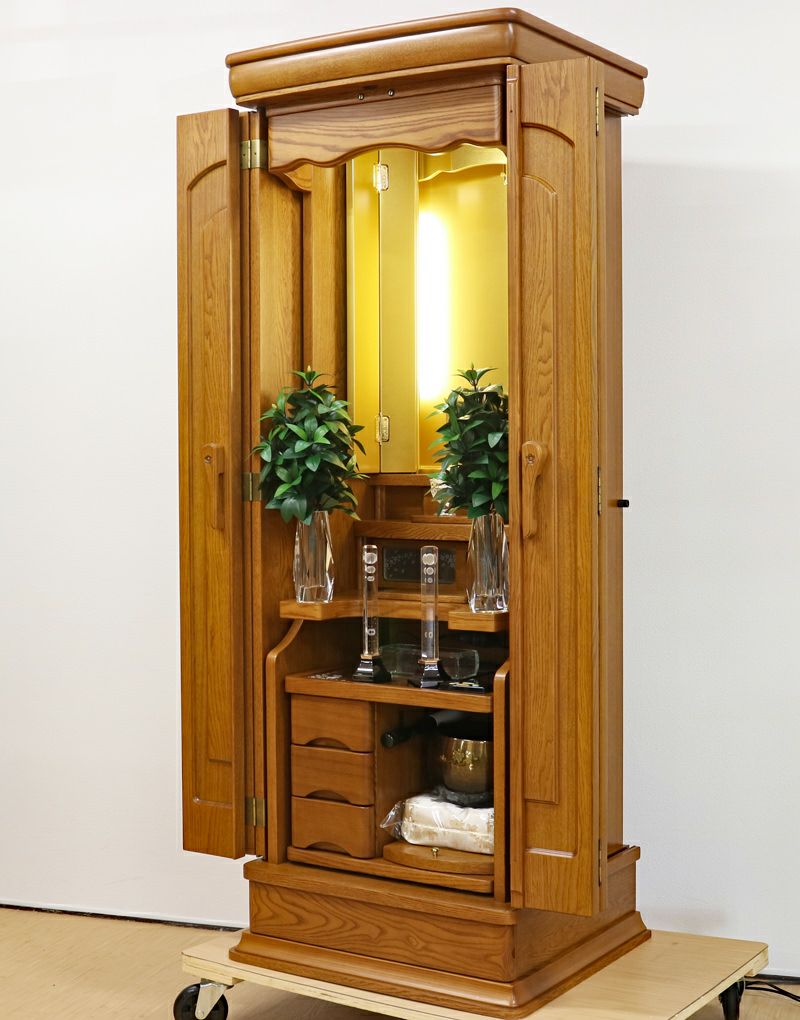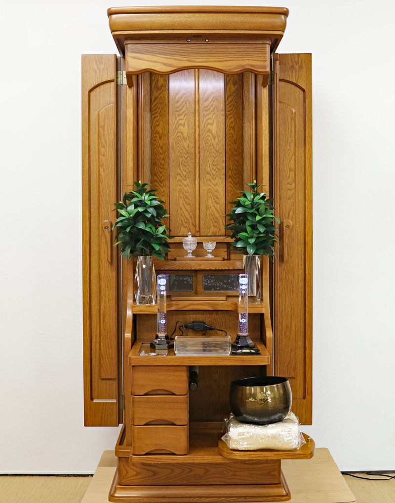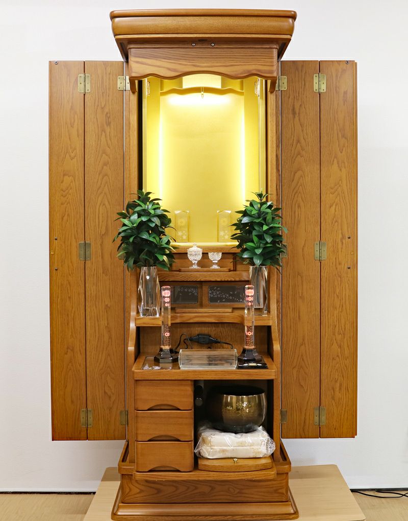 品格あるタモ材の色味と木目は心の安らぎと希望溢れる請願の祈りの題目をあげるためのすばらしい仏壇になります。大切につかわれ、綺麗な状態ですのでおすすめの商品になります。 リモコン仕様の仏壇で、LED照明が仏壇内に3か所設置されております。 大戸は押し込み式の大戸を採用しておりますので、大戸を全部開くことによって斜めからでもご本尊様を拝すことができます。会場・拠点にも十分対応できます。