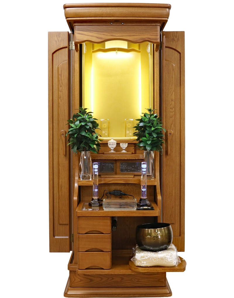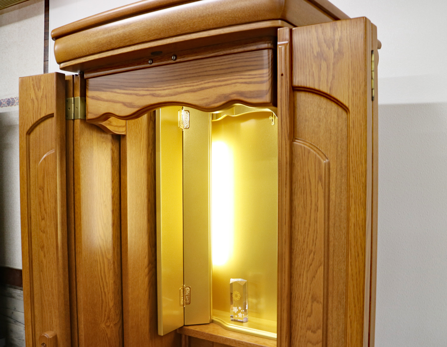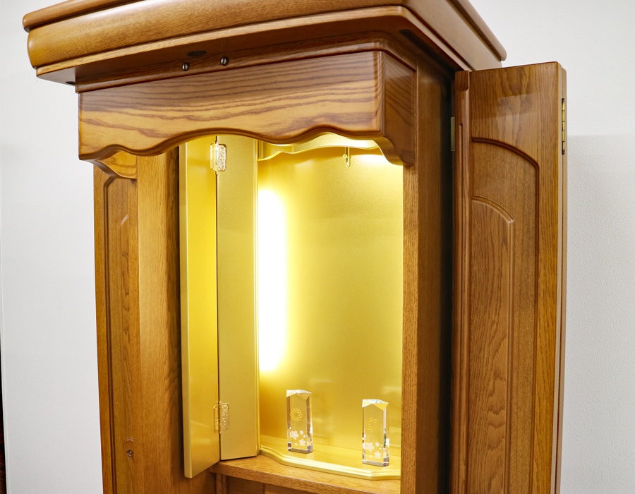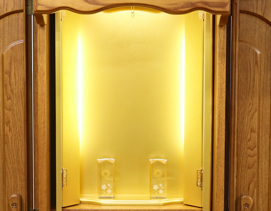 お厨子を開くと美しくクリア金色塗装厨子板がご本尊様をさらに荘厳にし、3か所(厨子両脇+仏壇内上部)のLED照明で仏壇内を適度に明るく照らしてくれます。