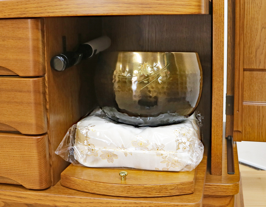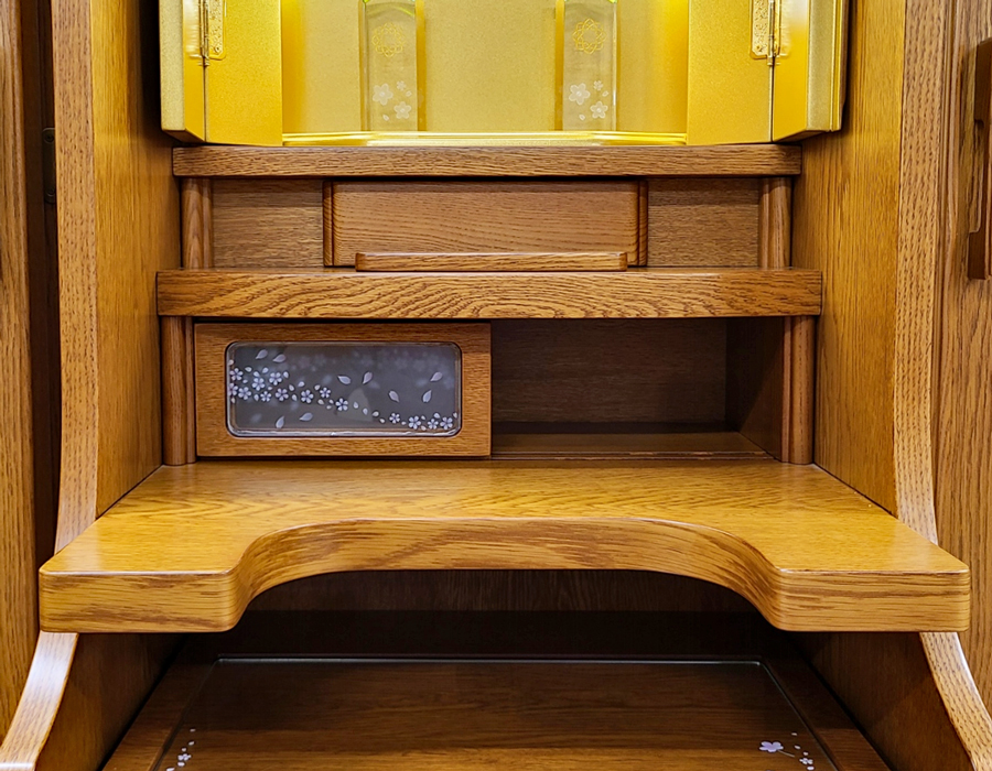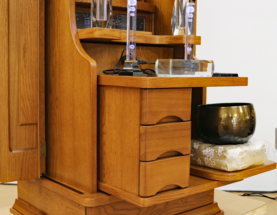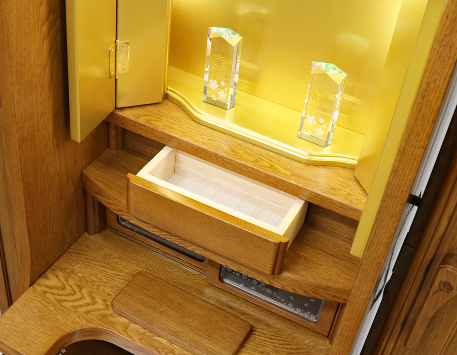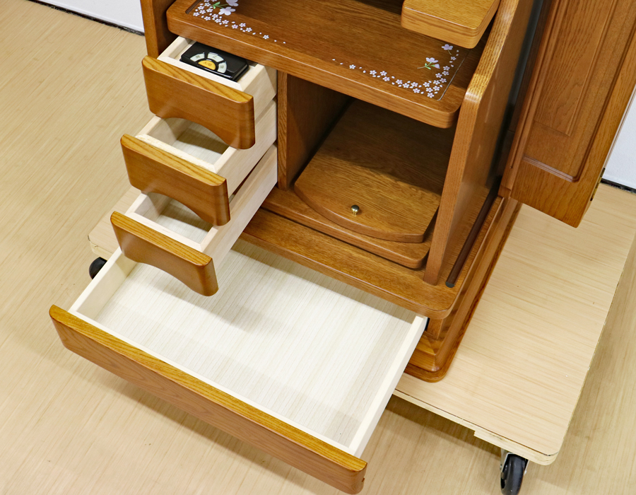 仏壇下部に引き出しが4か所ございます。 お念珠・お教本・お線香なども余裕をもって収納できます。