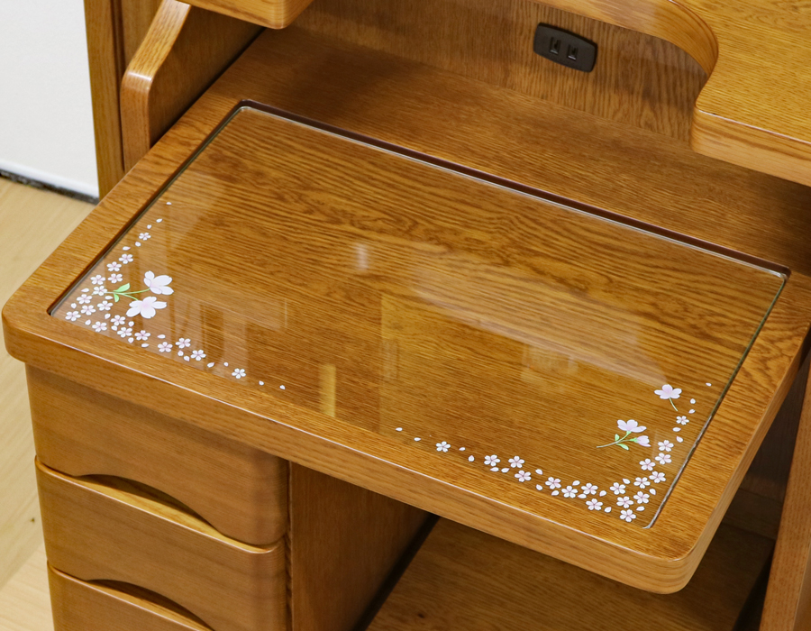 収納経机のガラスにはかわいらしいお花がデザインされております。