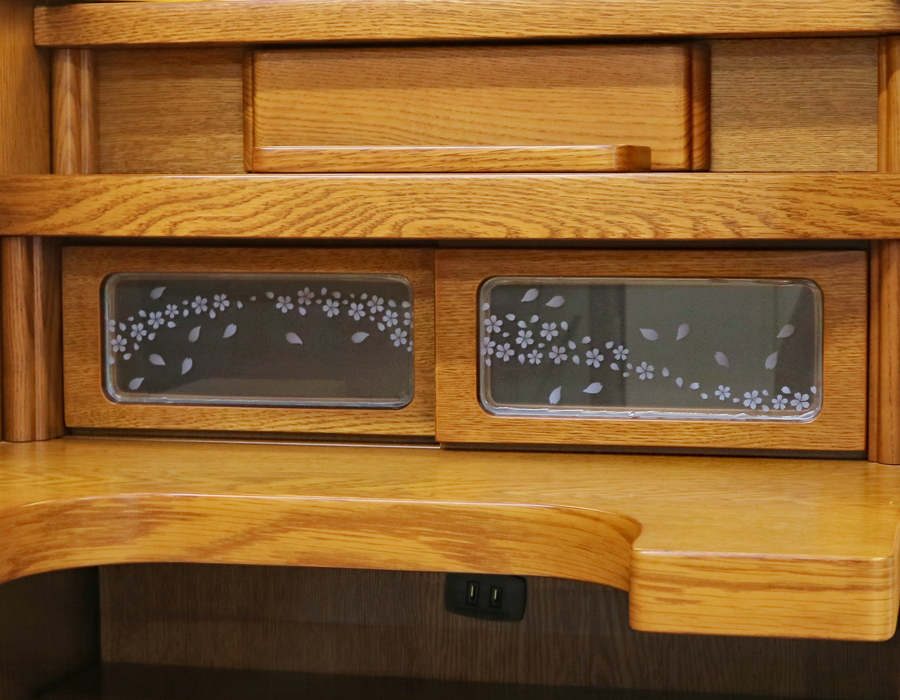 厨子下の収納スペースのガラス部分には美しい、流れ桜がデザインされております。