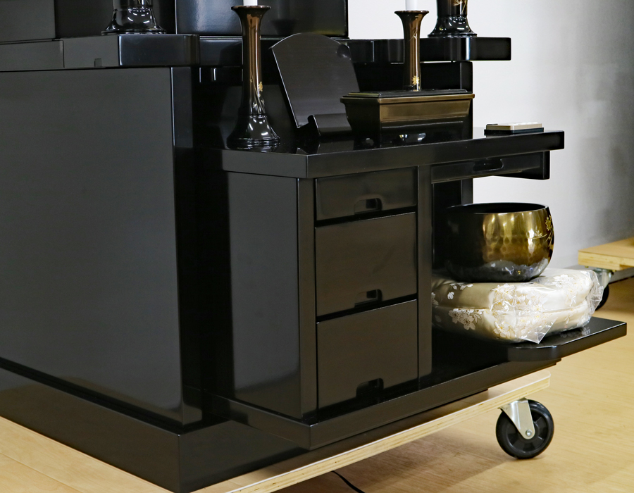 花台をスライドしますと、仏壇全体が広くなりよりご本尊様を荘厳することができます。 拠点・地区での会合にぴったりです。