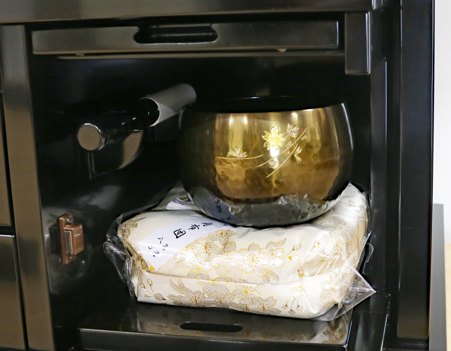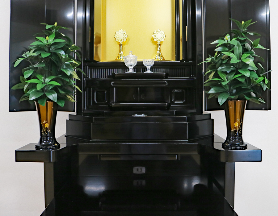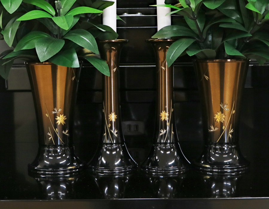 仏具付き選択の場合、銅器生産で有名な高岡製の高級彫金入り銅器仏具セットが付属いたします。