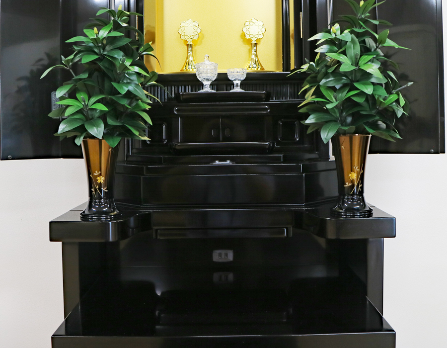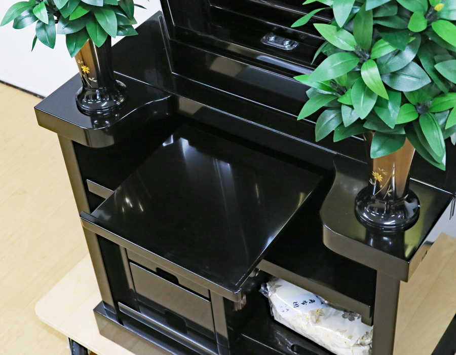 おシキミの花瓶の台は横にスライドしますので、 勤行の時にはご本尊様がよりすっきりとみることができます。