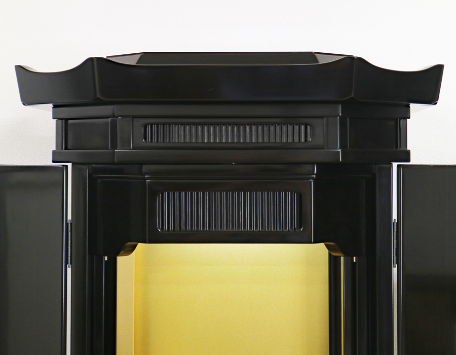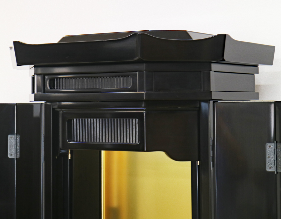 お厨子を開くと美しくクリア金色塗装の厨子板がご本尊様をさらに荘厳にしてくれます。 内部にはLED照明も付属していますのでご本尊様を明るく照らしてくれます。