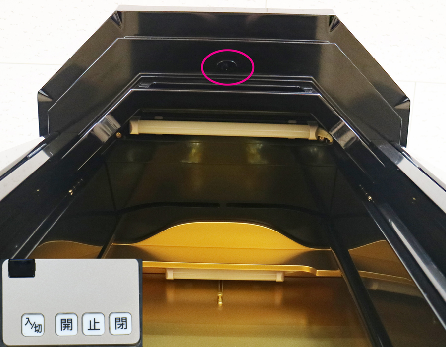 上記お写真の赤丸の箇所にリモコン受信機があります。ここに向けてリモコンを使用して下さい。