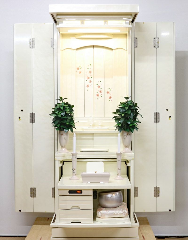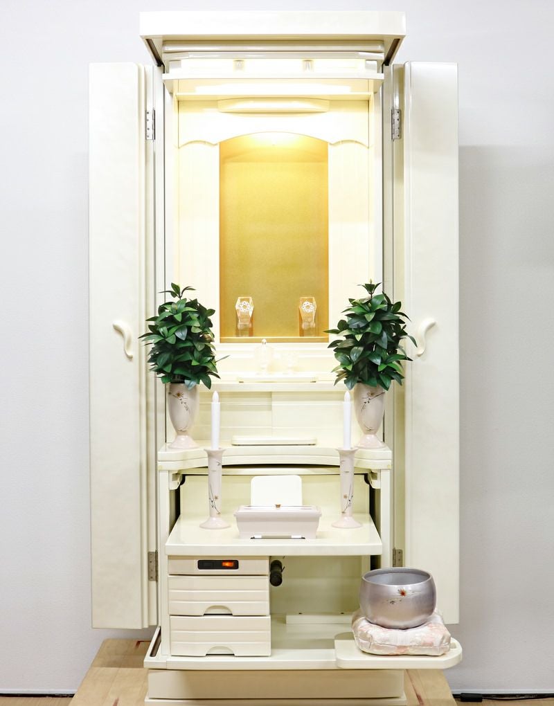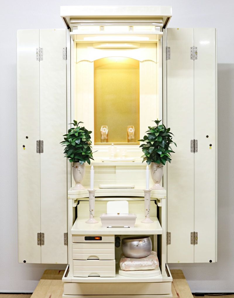 国産優良人気家具調仏壇になります。最高級のホワイトパール塗装はグラデーションの特殊加工が施されています。 家具調ながら大きくご本尊い包まれるそんな優しい豊かさのある仏壇に仕上がっています。