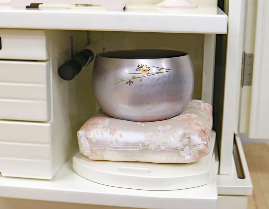 仏具付きを選択の場合、上記お写真の高岡製銅器仏具セット(優型枝桜彫金入りパールピンク)が付属いたします。