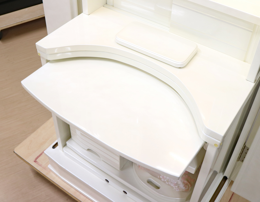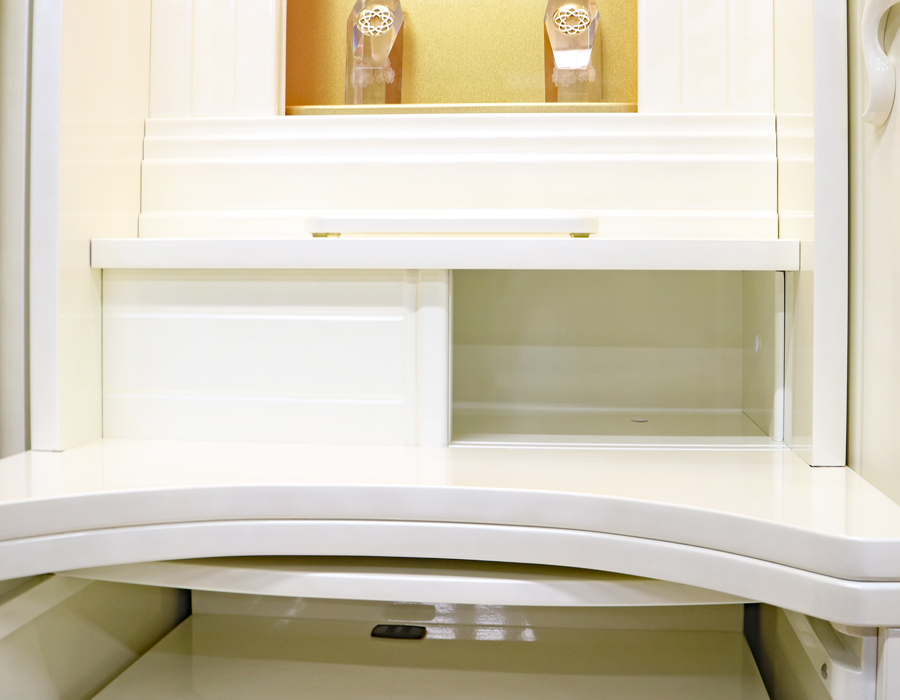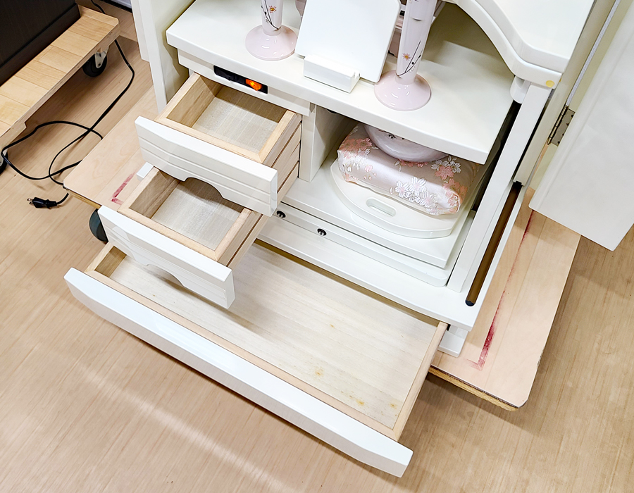 お仏壇全体の塗装は上記お写真のように、グラデーションのあるパールホワイト塗装に仕上がっております。