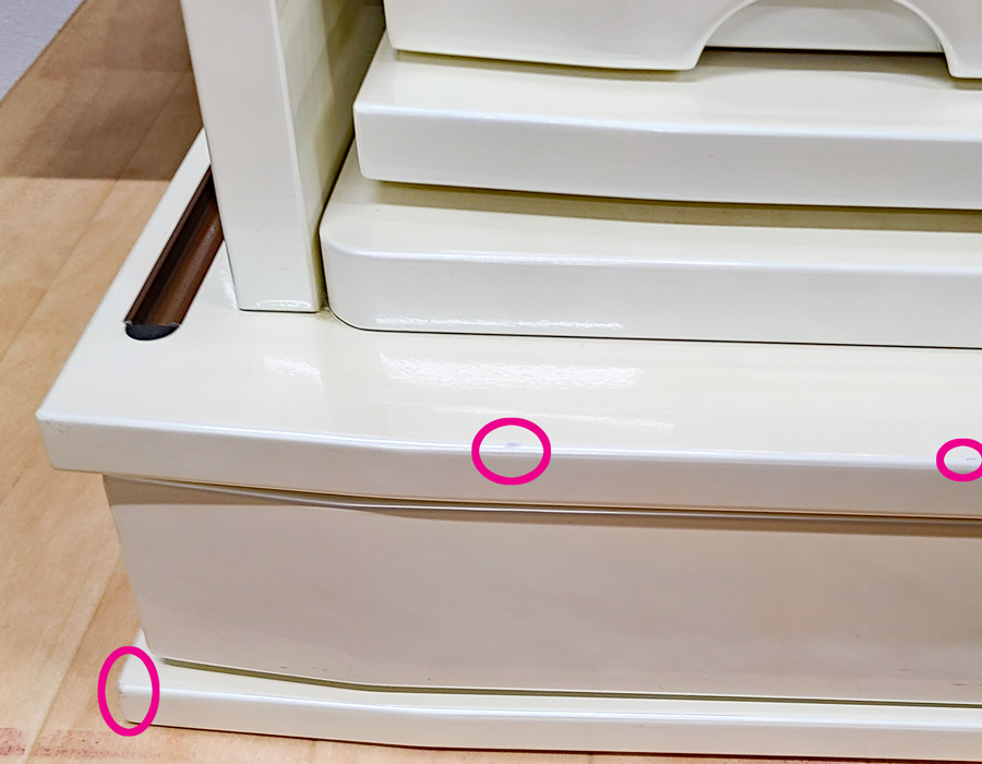 上記お写真の赤丸の箇所(お仏壇下部)に傷がありましたので、着色補修を致しました。