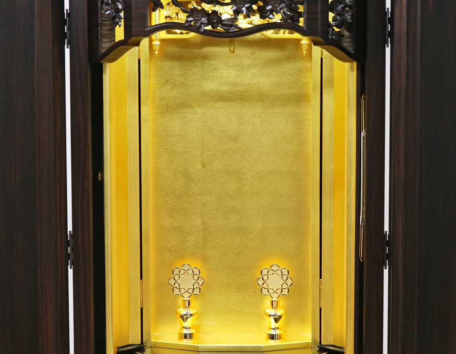 本金箔と金色塗装では輝きが違うのは一目瞭然です。 内部には蛍光灯照明も付属していますのでご本尊様を明るく照らしてくれます。