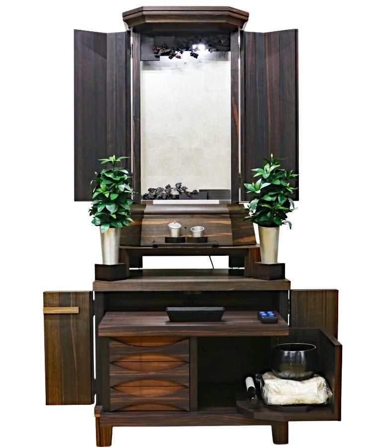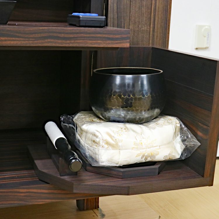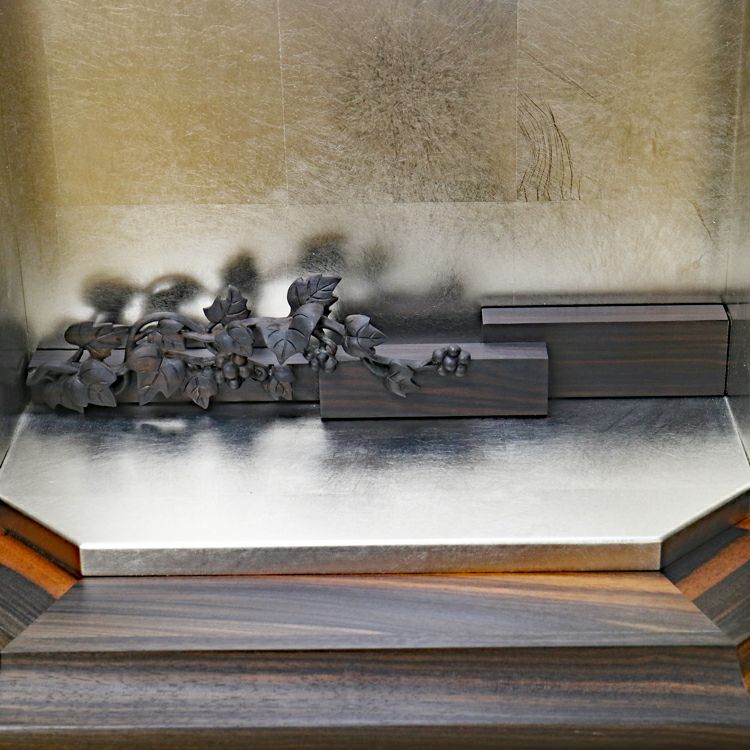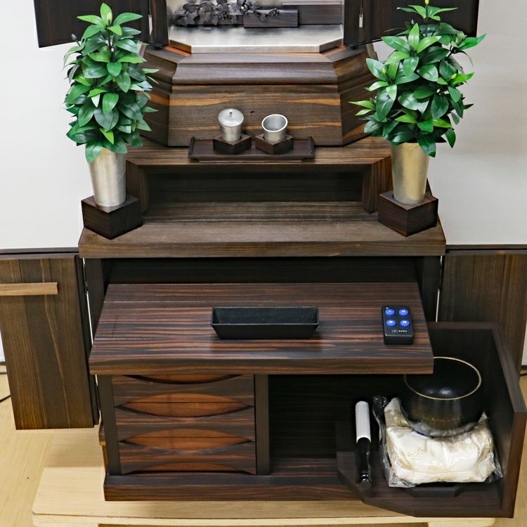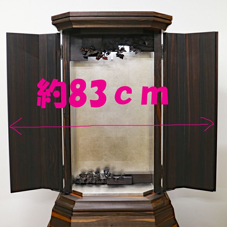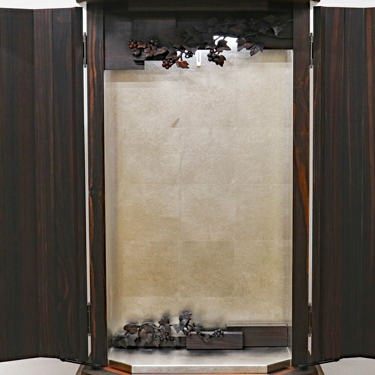 このお仏壇の見どころは、何と言っても手彫りの繊細な彫刻と、内部に施されたプラチナ箔の荘厳な輝きです。現代では、これほどの手間と時間をかけられる職人さんが非常に少なくなっており、新品で同様のものを製作することは極めて困難な時代に入っています。中古仏壇だからこそ手にすることができる「伝統芸術」とも言える一品です。内部のコード類やリモコン受信機も新品に交換し、末永く安心してお使いいただけるよう魂を込めてメンテナンスを施しました。