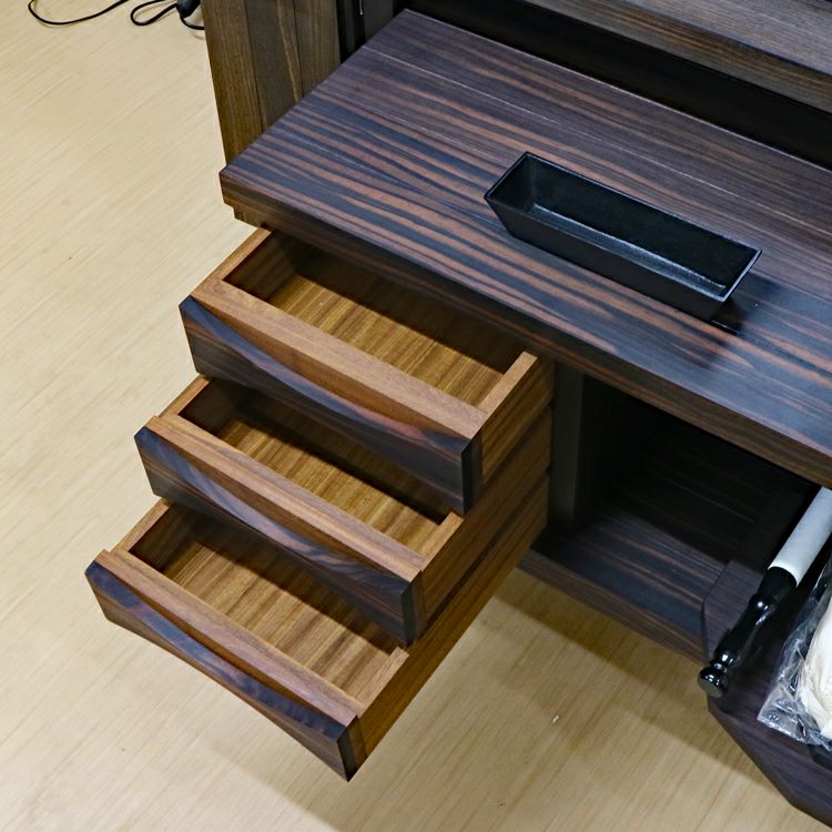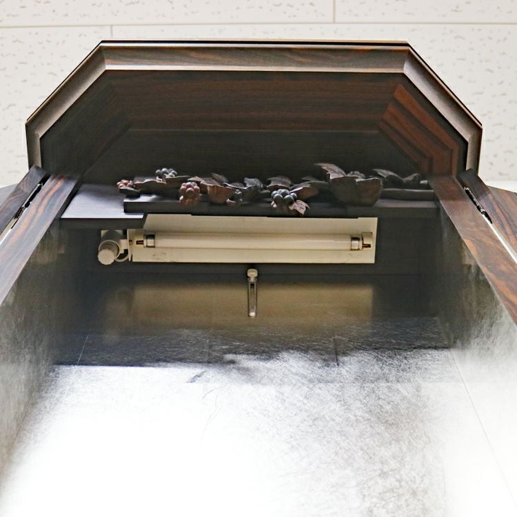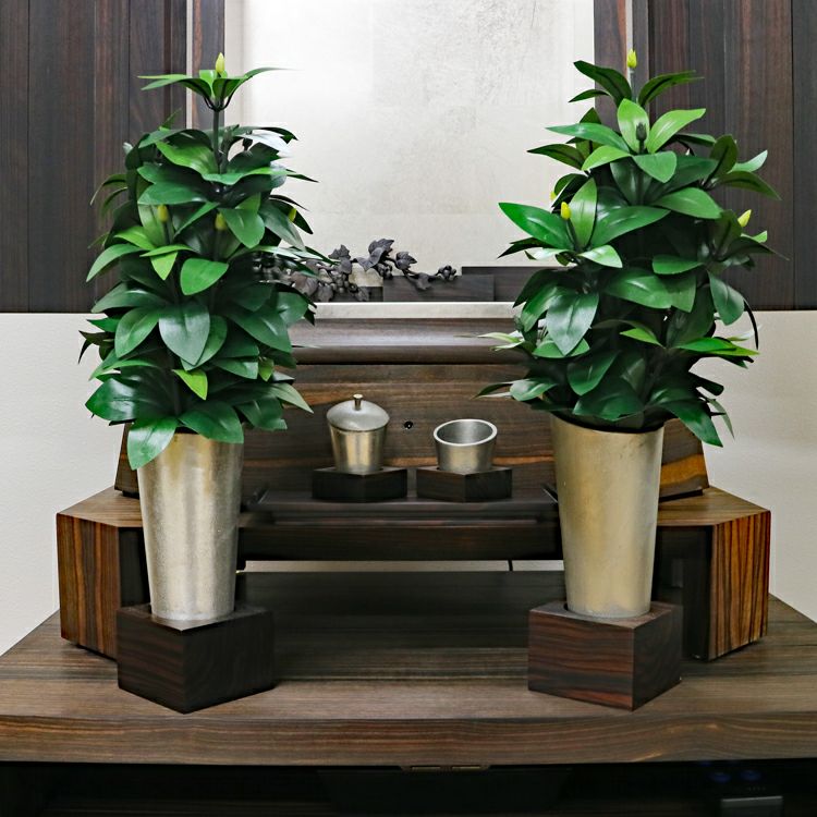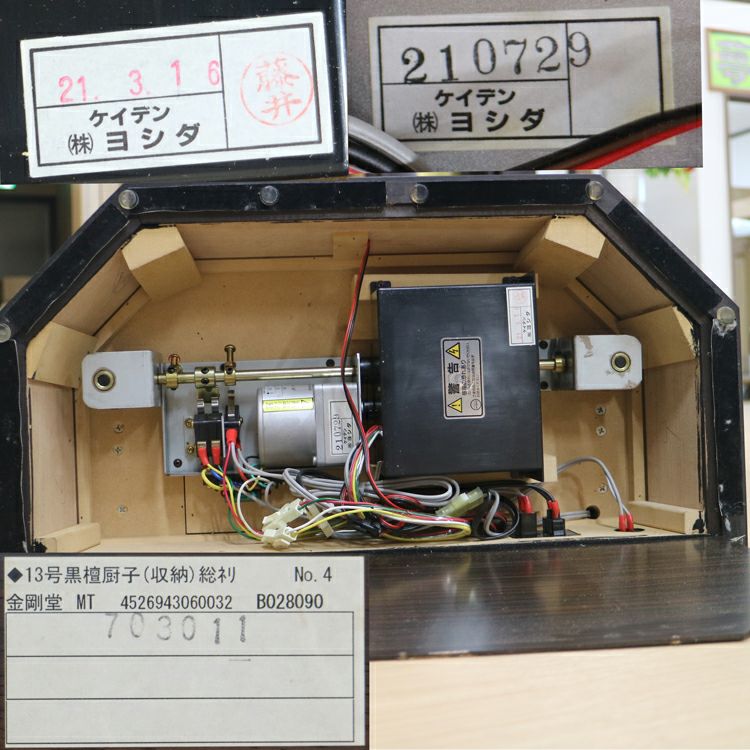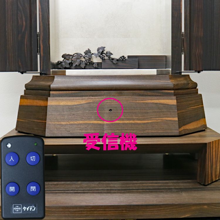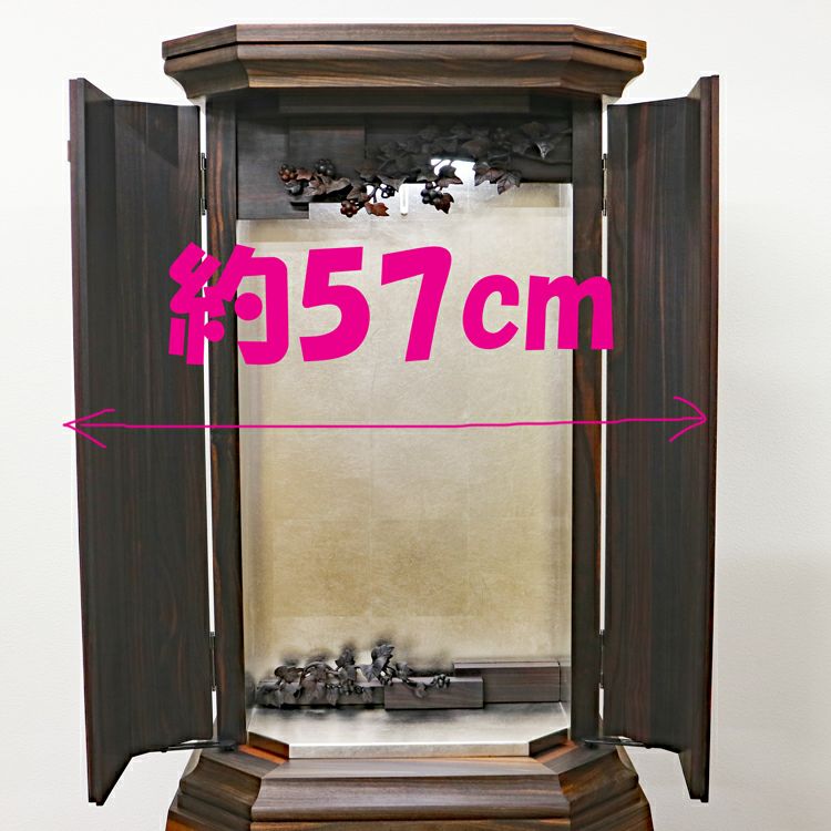 このお仏壇の見どころは、何と言っても手彫りの繊細な彫刻と、内部に施されたプラチナ箔の荘厳な輝きです。現代では、これほどの手間と時間をかけられる職人さんが非常に少なくなっており、新品で同様のものを製作することは極めて困難な時代に入っています。中古仏壇だからこそ手にすることができる「伝統芸術」とも言える一品です。内部のコード類やリモコン受信機も新品に交換し、末永く安心してお使いいただけるよう魂を込めてメンテナンスを施しました。