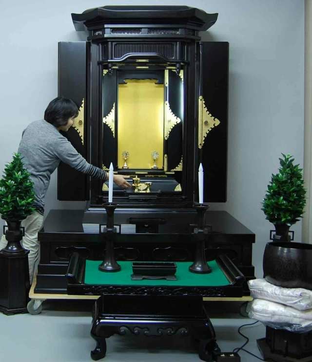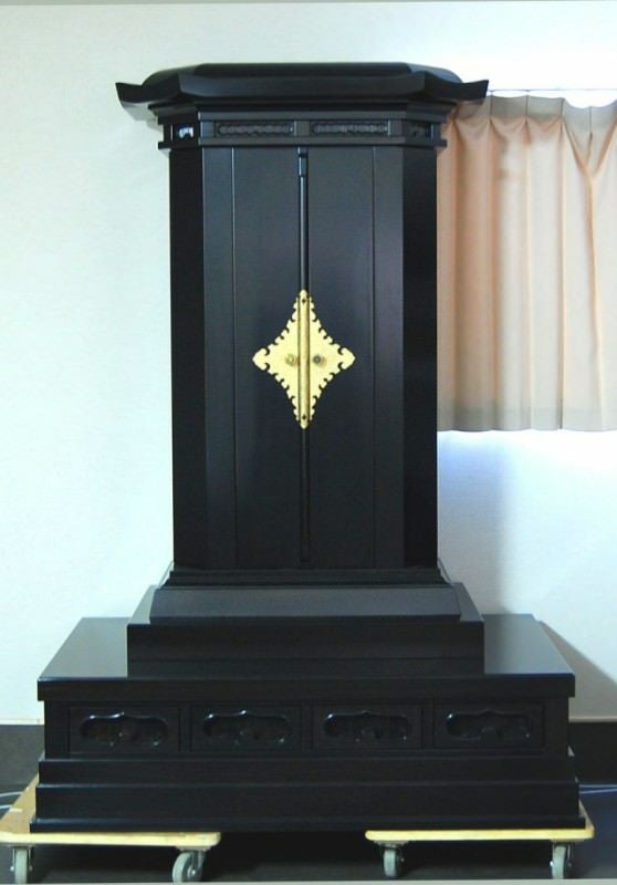 より良いお仏壇をお届けしたいので昨年末より メーカーさんに仏壇の下台を搬入し天板を張り替えていただきました。 仏壇の全体のデザインを考え中間の台も新しく製作していただきました かなり大きな仏壇でしたが、さらに10cmも高くなり204cmとなり ましたがそれでもこちらのほうが全体的に素晴ら しいバランスの良い仏壇になりましたので私的にとても満足しています!お仏壇の大きさがお分かりになるでしょう! 新型では上台と下台の間に新しい台を メーカーで作成いたしました。 これによりお仏壇全体のバランスがとても良くなります。