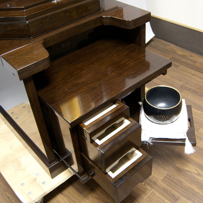 収納式経机には3段の引き出しが付属しています。引き出しの中には桐の箱が入っています。教本・念珠など充分に収納できます。