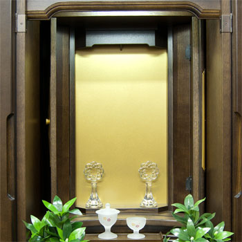 お厨子を開くと美しく煌びやかな金色がご本尊様を荘厳してくれます。内部には蛍光灯照明も付属していますのでご本尊様を明るく照らしてくれます。