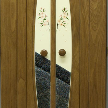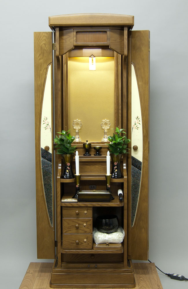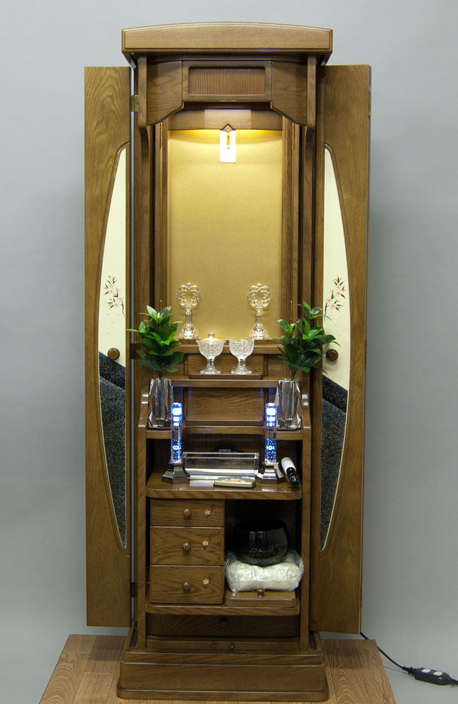 シックな木目の美しい家具調仏壇です。収納経机・リン台・花台もスライド式です。現代の住宅事情に合わせた大変機能的なお仏壇となっております。ご自宅に設置した瞬間そこは広宣城としての法座が演出されることでしょう。