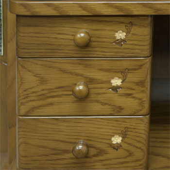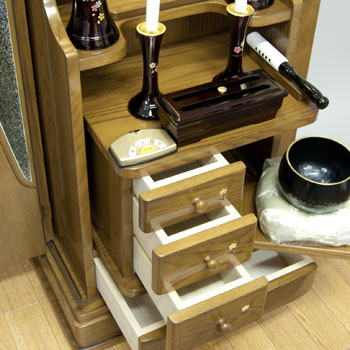 収納式の経机には便利で使いやすい引きだしが4段、リンもしっかりと収納できます。引き出しは桐製。教本・念珠など充分に収納できます。
