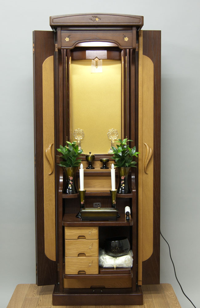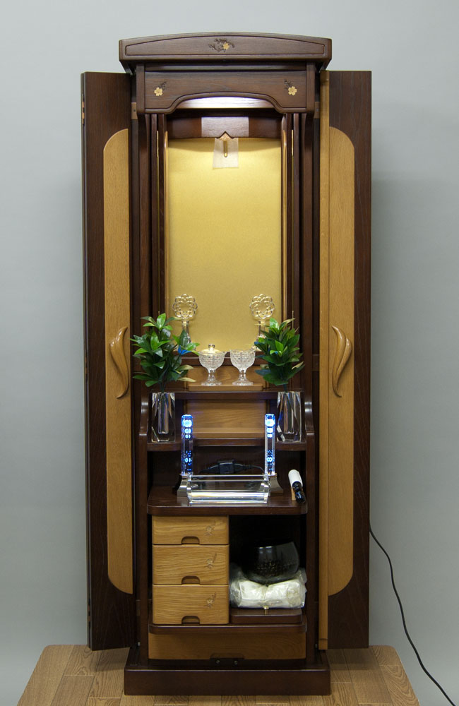 ツートンのデザインと木目が美しい家具調仏壇です。現代の住宅事情に合わせた大変機能的なお仏壇となっております。ご自宅に設置した瞬間そこは広宣城としての法座が演出されることでしょう。