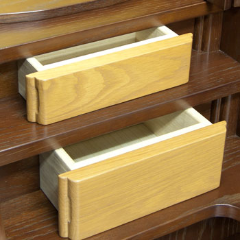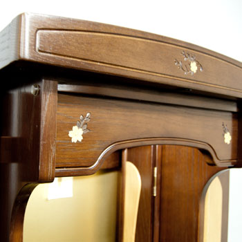 収納式の経机には便利で使いやすい引きだしが4段、リンもしっかりと収納できます。引き出しは桐製。教本・念珠など充分に収納できます。