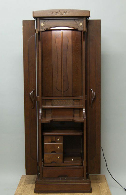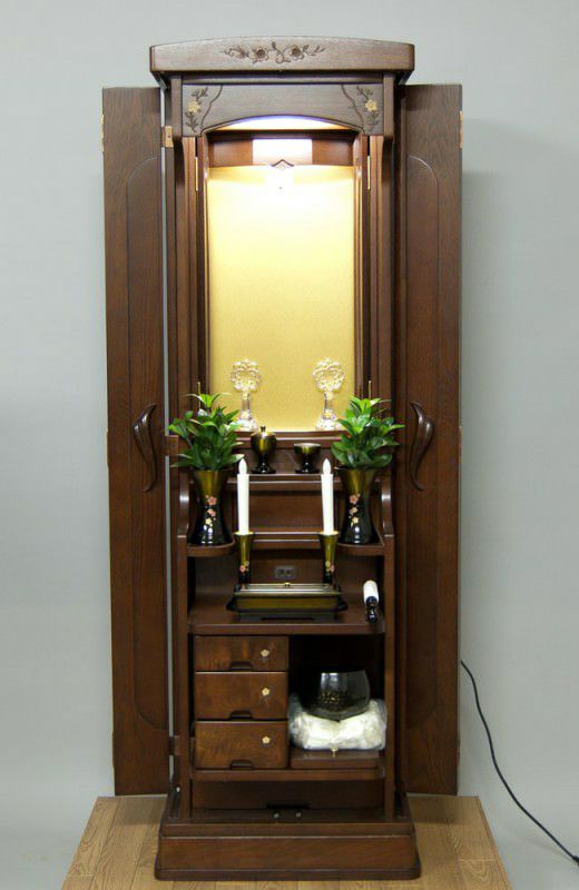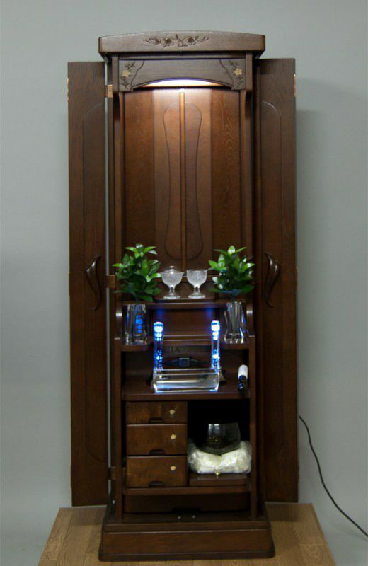 シックなレトロ調のデザインと木目が美しい家具調仏壇です。現代の住宅事情に合わせた大変機能的なお仏壇となっております。ご自宅に設置した瞬間そこは広宣城としての法座が演出されることでしょう。