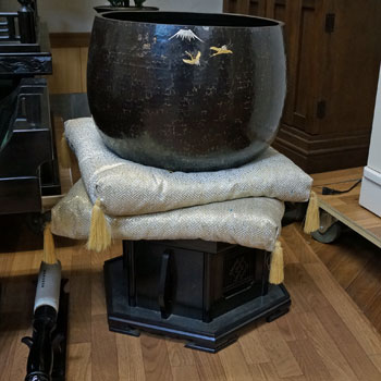 大型のおリンセットは高さが67cm、リン自体の口径は37.5cmと大き目、彫金入りの高級本手打ちリンです。余韻は会館並みです