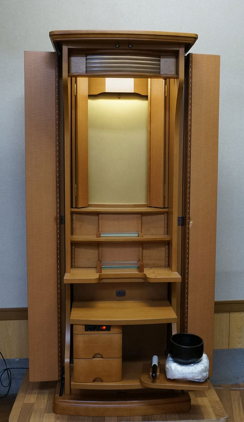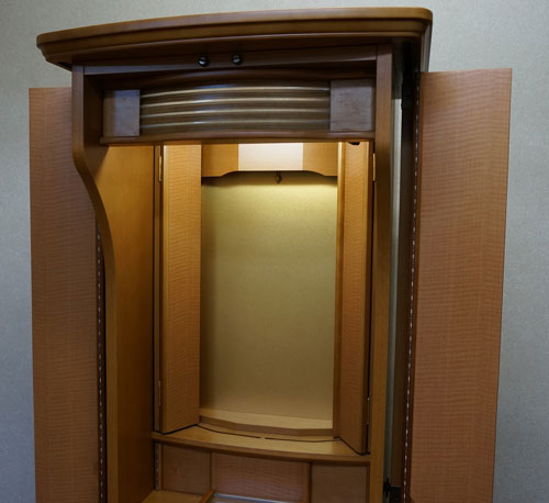 仏壇内部には蛍光灯照明も付属していますのでご本尊様を明るく照らしてくれます。自動扉はとてもスムーズに開閉しています。