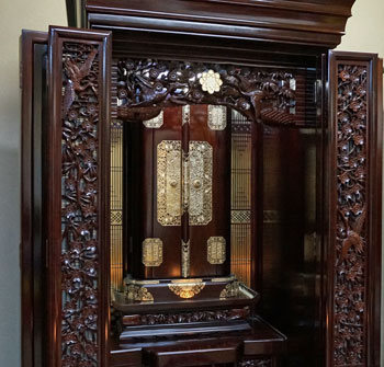 欄間と扉には見事な彫刻と厨子金具で仏壇を荘厳しています