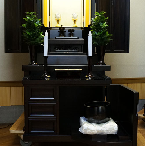 中古280は自動開閉装置のメンテナンス、仏壇全体のクリーニング作業、写真掲載の新品仏具1式をお付けしてご用意したしました。