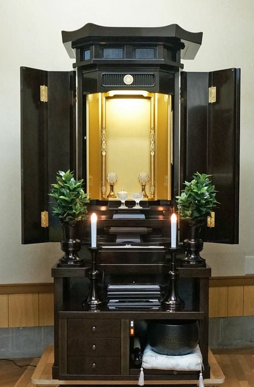 中古283は自動開閉装置のメンテナンス、仏壇全体のクリーニング作業、写真掲載の仏具1式をお付けしてご用意したしました。