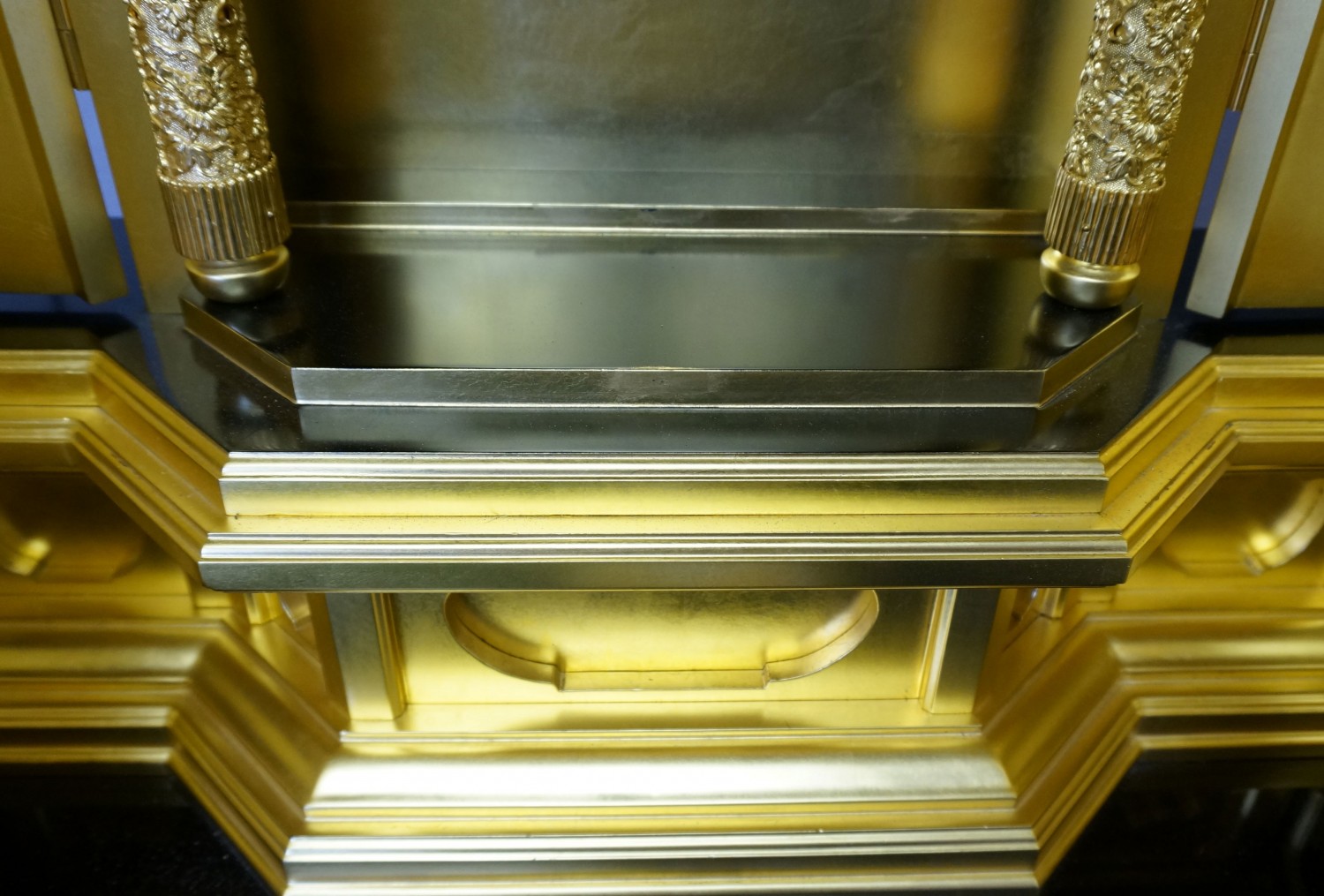 素晴らしい! 暫し 見とれる そんな仏壇がこちらの厨子型仏壇です。私もこの業界に32年いますが、こんなお仏壇、今まで見たことがありませんでした。うわさでは聞いたことがありましたが・・・さて、今回は本当に貴重な仏壇のご紹介です。まずは仕上げ本漆です、もともと仏壇は千にも及ぶ部品から成り立ちますので、その一つ一つに手間をかけて漆を細工する。忍耐の時間が過ぎていくそんな工程になっています。同じく本金箔も非常に熟練を要す職人の技になります。その両方の技術を金具で止め仕上げていきます。欄干もこちらの大きさになりますと設置時に組み立てとなる作業が必要となります。