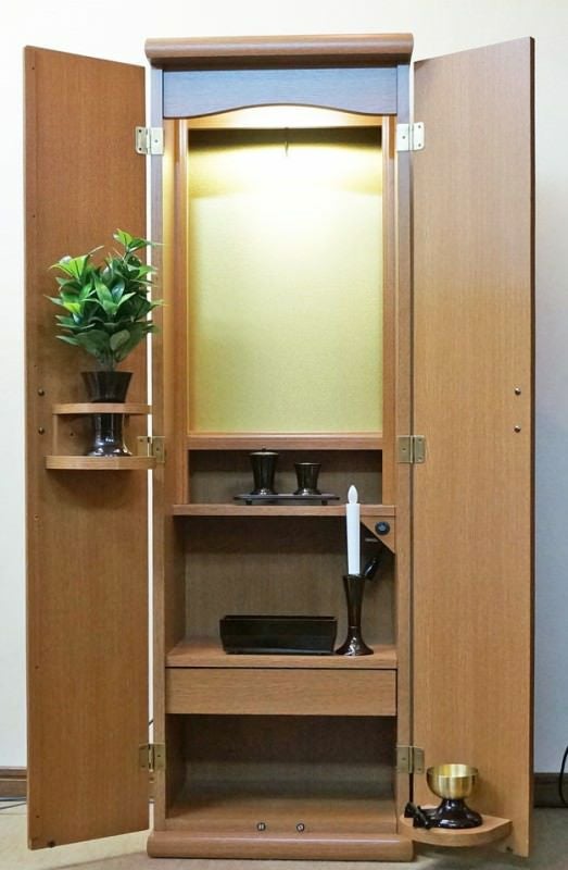 家具調仏壇の中では 一番小さいタイプです。扉に 花台とリン台もセットされコンパクトですが 収納もあります