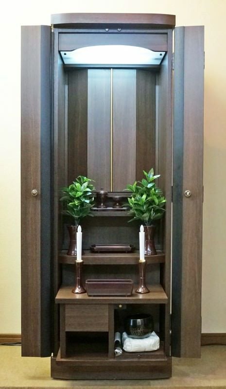 SUKKIRI 家具調仏壇の。扉に 花台とリン台もセットされコンパクトですが 収納もあります