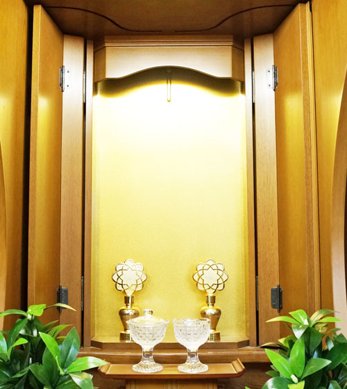 御本尊さま御安置するお厨子内は金色に塗装され、しっかりとした金物仏具セット、クリスタル仏器茶器など写真掲載仏具1式付です