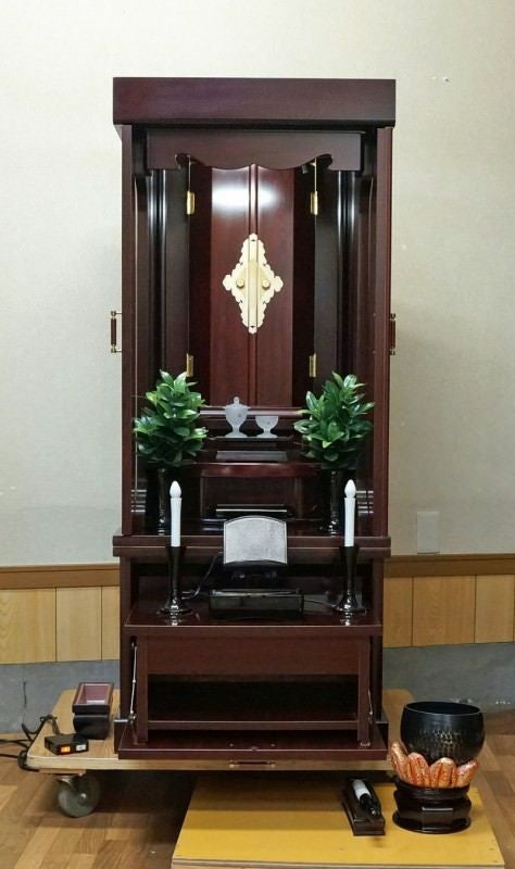 人気のワインレッド色すっきりとした仏壇です。人気の机が収納型でお手頃価格でご提供!