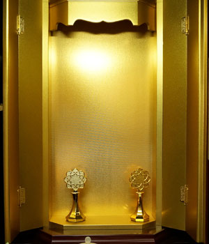 御本尊さま御安置するお厨子内は金箔仕様、仏壇天井手前に 6wの蛍光灯がついています。仏具は写真掲載のもの